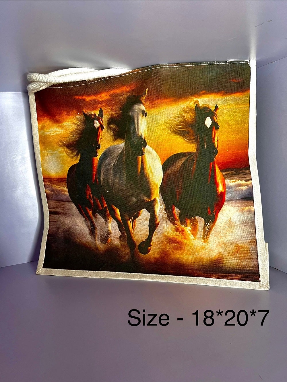 The most dramatic feature of such a tote is its stunning lifelike high-definition print-in-the-moment of three galloping horses, drawing from Rajasthani inspirations-rather from the freedom, power, or determination it signifies. Picture this against a blazing sunset sky and golden waves thrashing against their hooves.